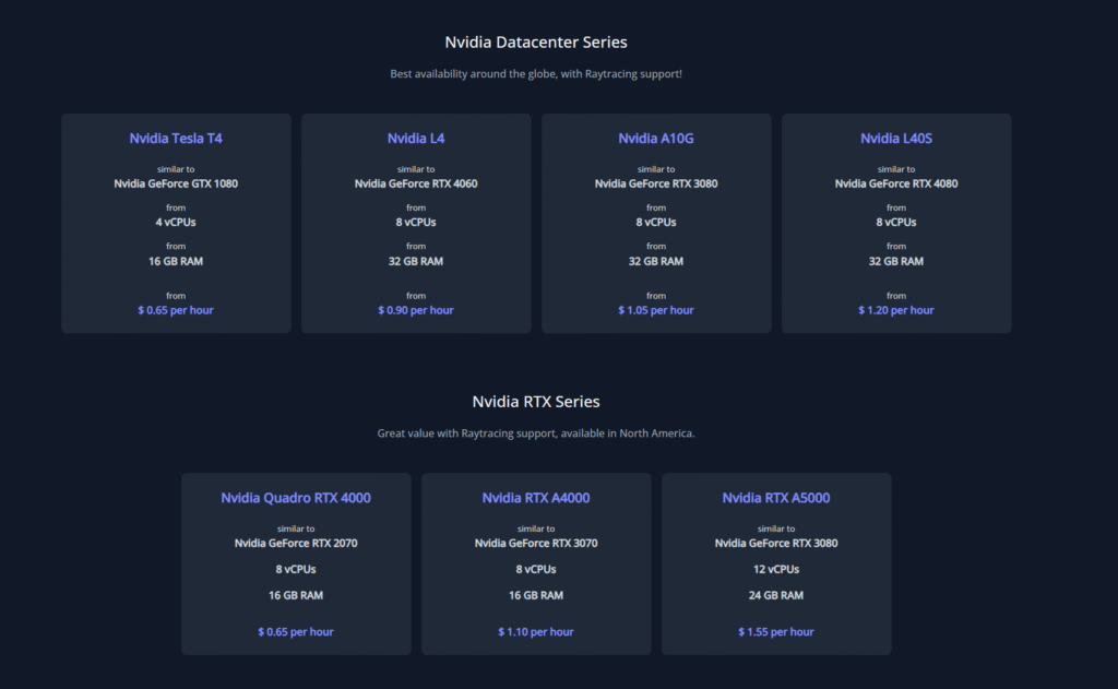 - L4 (like RTX 4060): $0.90/hour, 8 CPUs and 32 GB RAM.